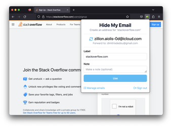 iCloud Hide My Email เป็นส่วนขยายความเป็นส่วนตัวที่ใช้การสมัครสมาชิกซึ่งออกแบบมาสำหรับผู้ใช้ Firefox ที่ต้องการปกป้องที่อยู่อีเมลส่วนตัวของตน เครื่องมือนี้ช่วยให้ผู้ใช้สามารถสร้างนามแฝงอีเมลที่ไม่ซ้ำกันเพื่อใช้เมื่อสมัครเว็บไซต์ ซึ่งช่วยลดสแปมและปกป้องอีเมลหลักของพวกเขา ส่วนขยายนี้มีอินเทอร์เฟซป๊อปอัพที่ใช้งานง่ายสำหรับการสร้างและสำรองที่อยู่อีเมลใหม่ ทำให้มั่นใจได้ถึงประสบการณ์ที่ราบรื่น